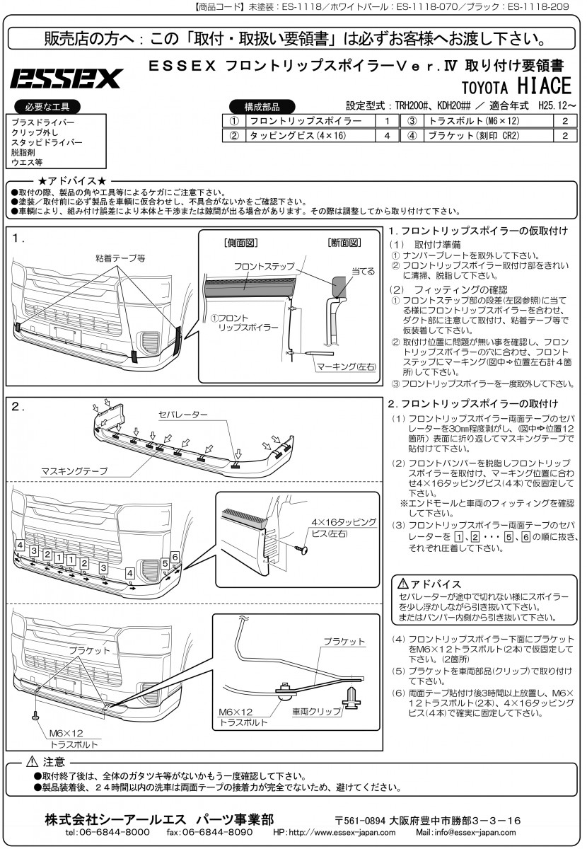 ESSEXのコンセプトでもある「純正クオリティ」にこだわった、フロントリップスポイラーVer.IV。 エアロパーツで一般的なFRP製ではなく、純正スポイラー同等のABS製を採用しておりフィッティングも純正レベル。 シンプルなデザインながら目を惹くプレスラインが特徴のスポイラーです。 純正フロントバンパーと比べて、フォグランプ下の部分は約7cm下がり、ステップ部分は約5.5cm下がります。 カラーは未塗装・ホワイトパール(070)塗装済・ブラックマイカ(209)塗装済があります。 また、フリッパーを装着させることで、高級感が増し、よりレーシーな雰囲気を醸し出します。 【本製品装着可能なフリッパー】 フリッパーVer.3 🔗商品ページはこちら フリッパーVer.4 🔗商品ページはこちら ※こちらの商品は、9型ハイエースの適合致します。 現車にて確認済みでございます。 【純正色塗装済み商品に関して】 カラー番号での調色になりますので、お客様のお車の色と異なる場合が御座います。 (ボディの日焼け具合や、素材の違い等) カラー違いに関してのクレームはお請け出来ませんのでご容赦下さい。 色の違いが気になる方は、未塗装をご購入頂き、お車の色と合わせながら塗装することをおススメします。 ▼商品説明 ▼取付け方法 【ご購入時の注意事項】 ●大型商品の為法人宛、屋号のある建物、西濃運輸支店止めのみ対応。 ●法人宛西濃支店止めであっても沖縄県・または離島への配送料金については都度お見積りとなります。 ご購入前にお問合せください。 ●大型配送品は個人宅配送ご希望される場合、別途追加料金が発生します。 ●各配送については必ず送料規定をご確認の上ご購入をお願いいたします。→🔗送料区分 ●その他、ご購入時は必ず🔗こちらをご一読ください。 商品コード: es-1118~es-1118-209 ES フロントリップスポイラーVer.IV ABS製 ■ハイエース標準ボディ 4型以降対応 販売価格:¥46,200~59,400 送料 ¥6,380 ※東北、北海道、九州、沖縄は別途送料が加算され、表示金額とは異なります カラー 選択してください ブラック(209) ホワイトパール(070) (品切れ中) 未塗装 (品切れ中) 数量 在庫 0~41 カートに入れる ブランド ESSEX 適合車名 ハイエース/レジアスエース 2013年12月 4型~現行対応 ナロー標準ボディ 配送サイズ 配送区分:🔗F その他注意事項ご確認下さい。 関連カテゴリ: ハイエースカスタムパーツ ハイエースカスタムパーツ > 外装カスタムパーツ ハイエースカスタムパーツ > 外装カスタムパーツ > エアロパーツ フロント ハイエースカスタムパーツ > 外装カスタムパーツ > エアロパーツ フロント > ナロー6型 ハイエースカスタムパーツ > 外装カスタムパーツ > エアロパーツ フロント > ナロー4~5型 ブランド別 > ESSEX ツイート