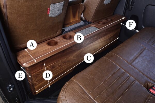エンジンフードをスッキリ見せて、シンプルなリアスペースを作るデッキカウンター エンジンフードからの熱や騒音、振動を防ぎながら、 スッキリとしたリアスペースを作りたいというならば、「デッキカウンター」がオススメ。 天板とキャビネットには無垢材を使用。 温もりを感じつつ、スッキリとしたリアスペースを作り出します。 また、デザインシリーズにはジュースホルダー計4つの他に小物トレーも採用。 固定方法は、付属のマジックテープでカウンターと純正カーペットを密着するだけ。 まさに置くだけの“ポン付け”感覚で装着できます。 もちろん、オイル交換やエンジンフードの開閉時の脱着もカンタンに行えます。 デッキカウンター寸法詳細 A.テーブル奥行:175mm B.テーブル全幅:1,410mm C.ボックス全幅:1,350mm D.ボックス高:370mm E.ボックス出幅:65mm F.ボックス~シート間隔:360mm ※ミリ単位の寸法につきましては車によって多少の誤差があります。 ※その他、詳しい寸法はお問い合わせください。 (ご注文時の注意事項】 ※純正フロア以外の場合、高さ調整が必要です。 床張加工等で床の高さが変わっている場合、そのままのご注文では高さ合わずしっかりとフィットしませんが、有料オプションの「高さ調整」をお選び頂くことでご希望の高さに加工して出荷いたします。 高さ調整をお選びいただく場合は、下記写真中の赤線部分の長さを測定して「高さ調整(mm)」の欄にmm単位でご記入ください。 豊富なカラー展開 【ご購入時の注意事項】 ●メーカー直送品でございます。代引き・同梱・配送方法のご指定はできません。 ●納期につきましてお急ぎの場合は事前にご確認下さい。 ●各配送サイズ・送料一覧→🔗送料区分 ●沖縄県・離島への配送料金については都度お見積りとなります。ご購入前にお問合せいただくか、弊社案内メールにてご確認ください。 ●その他、ご購入時は必ず🔗こちらをご一読ください。 商品コード: CP-2105-02~CP-2106-08 CP デッキカウンター ナローS-GL用 無垢材 デザインシリーズ 販売価格:¥109,780~115,280 送料 ¥2,860 ※東北、北海道、九州、沖縄は別途送料が加算され、表示金額とは異なります CP スタイル選択 選択してください California style type1 California style type2 Brooklyn style type1(カーキ) Brooklyn style type2 New York style type1 New York style type2 Sustainable Leather CP フロア形状 高さ調整サイズ(mm) 数量 在庫 0 入荷次第発送で予約 ブランド/メーカー品番 CRAFTPLUS(クラフトプラス) HNR-D010CSM-01 California style type1 HNR-D010CSM-02 California style type2 HNR-D010BSM-01 Brooklyn style type1(カーキ) HNR-D010BSM-02 Brooklyn style type2 HNR-D010NYM-01 New York style type1 HNR-D010NYM-02 New York style type2 HNR-D010-2025M Sustainable Leather 適合車両 ハイエース/レジアスエース ナロー S-GL用 ※DXは取り付け不可 配送サイズ 配送区分:🔗D その他配送情報ご確認下さい。 関連カテゴリ: ハイエースカスタムパーツ > 内装カスタムパーツ > その他 ブランド別 > CRAFTPLUS ツイート